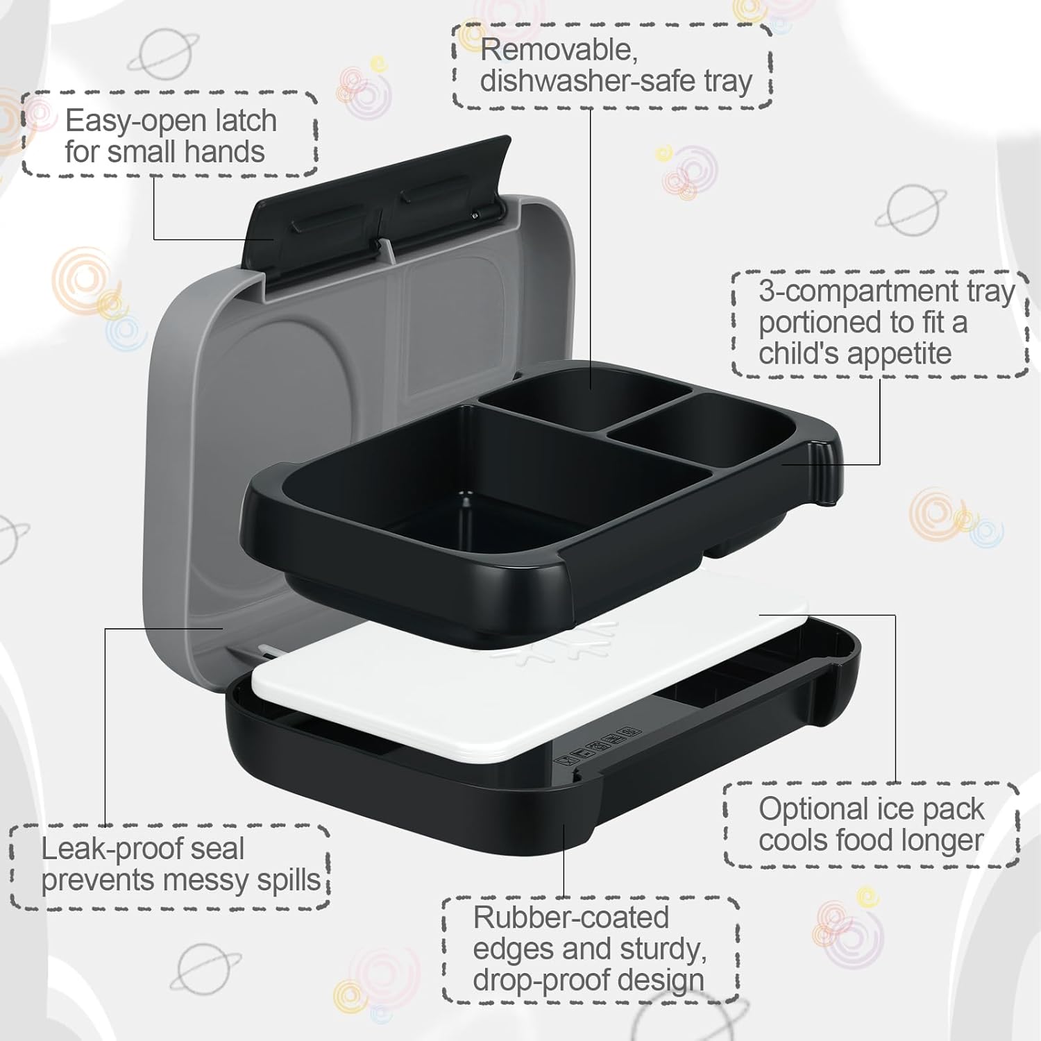 3-Compartment Bento-Style Lunch Box for Kids β Includes Removable Ice Pack β Built-in Utensil Slot β Leak-Proof, BPA-Free, Microwave & Dishwasher Safe β 44oz Total (Gray)